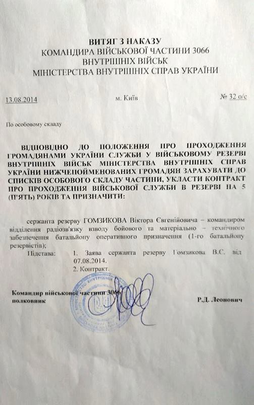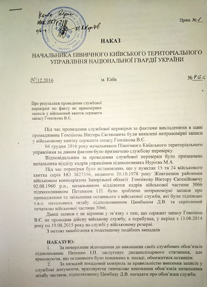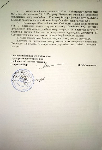Сообщается, что Миколенко игнорируя законы подписал указ, что один из его бывших подчиненных, сержант-доброволец Виктор Гомизков из батальона Кульчицкого якобы участвовал в боевых действиях будучи резервистом.