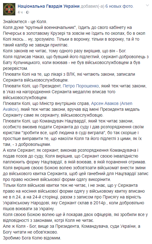 "Только Коля военные билеты тоже не читает, и не знает, что у Сержанта право на ношение военной формы одежды в военном билете вписано не в п.24, а на 24-й странице, вместе с записью о Присяге на верность Украинскому Народу, которую Сержант принес в 2014г., когда добровольно пошел воевать за Украину. Коля своей Божьей волей еще и наказал двух офицеров, которые сделали все в соответствии с законами, которые Коля не читает…Сделаем Бога Колю знаменитым", - отмечается в сообщении.