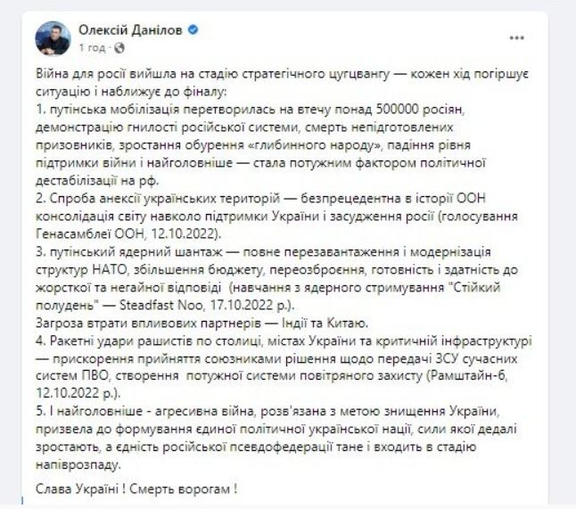 Секретарь Совета национальной безопасности и обороны Алексей Данилов заявил, что война, которую развязала Россия против Украины, вышла на стадию "стратегического цугцванга".
