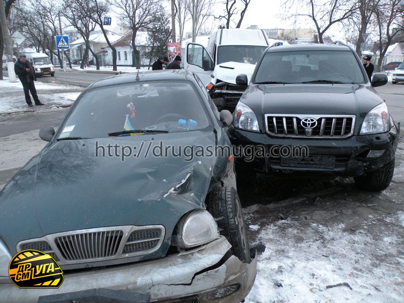 После этого, водитель автомобиля Тойота, изменила направление движения - налево и внедорожник врезался в стоящий (во встречном направлении для Тойота Ленд Крузер) автомобиль Деу Ланос.