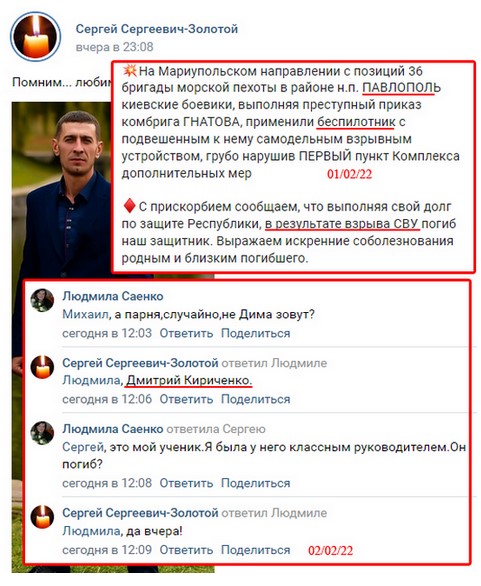 «Кириченко Дмитрий Алексеевич «Киря» (Иловайск, 08.06.1989) погиб 01.02.2022, предположительно, в районе Павлополя в результате внезапного падения СВУ с БПЛА», — написал автор публикации.