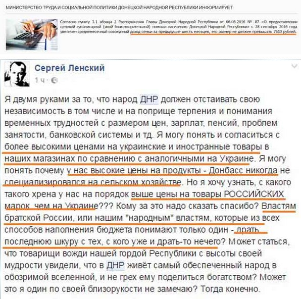 Обратите внимание на второй скрин. Сепаратист негодует по поводу того, что российские товары в ЛДНР стоят дороже, чем в Украине. То, что украинские товары в «республиках» дороже, чем в Украине, его устраивает…